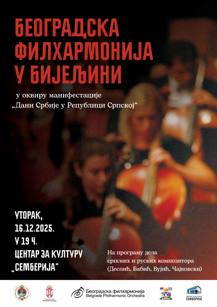 У оквиру манифестације  Дани Србије у Републици Српској   (у организацији Министарства културе Републике Србије) Београдска филхармонија ће одржати концерт у великој сали Центра за културу  „Семберија“  у Бијељини,  16.децембра 2025.године са почетком у 19:00 часова.