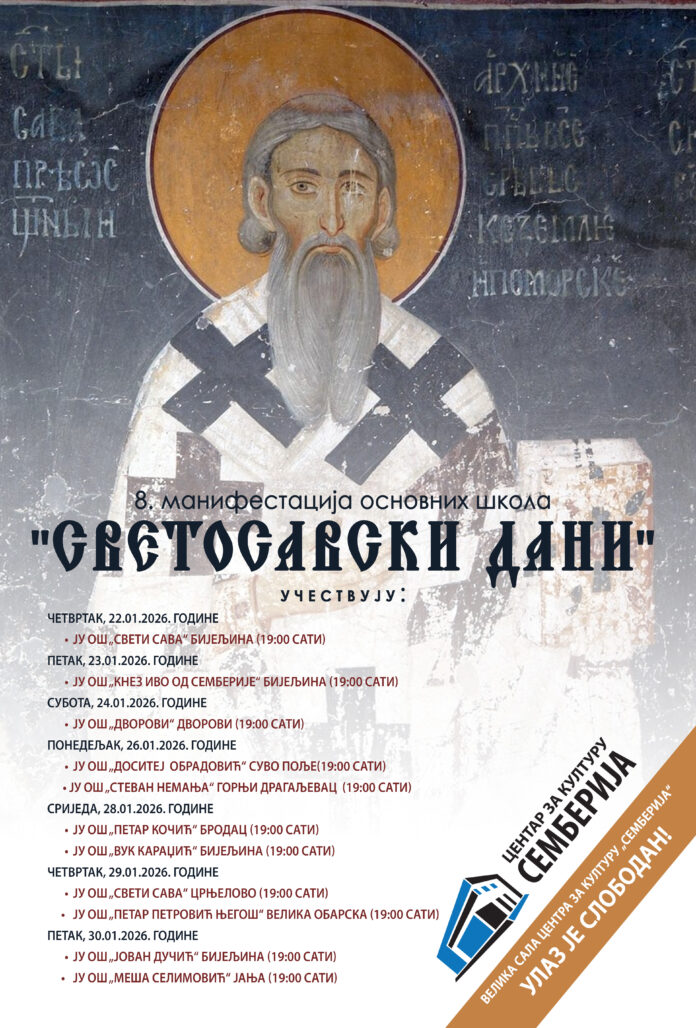 Осма манифестација основних школа “Светосавски дани” биће одржана од 22. до 30. јануара 2026.године у Центру за културу “Семберија” у Бијељини, а публици ће се представити ученици једанаест основних школа са подручја града Бијељина.